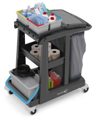 Daarnaast is de wagen voorzien van een open en goed toegankelijke opslagruimte en een bovenste tray voor het meenemen van schoonmaakmiddelen en materialen.