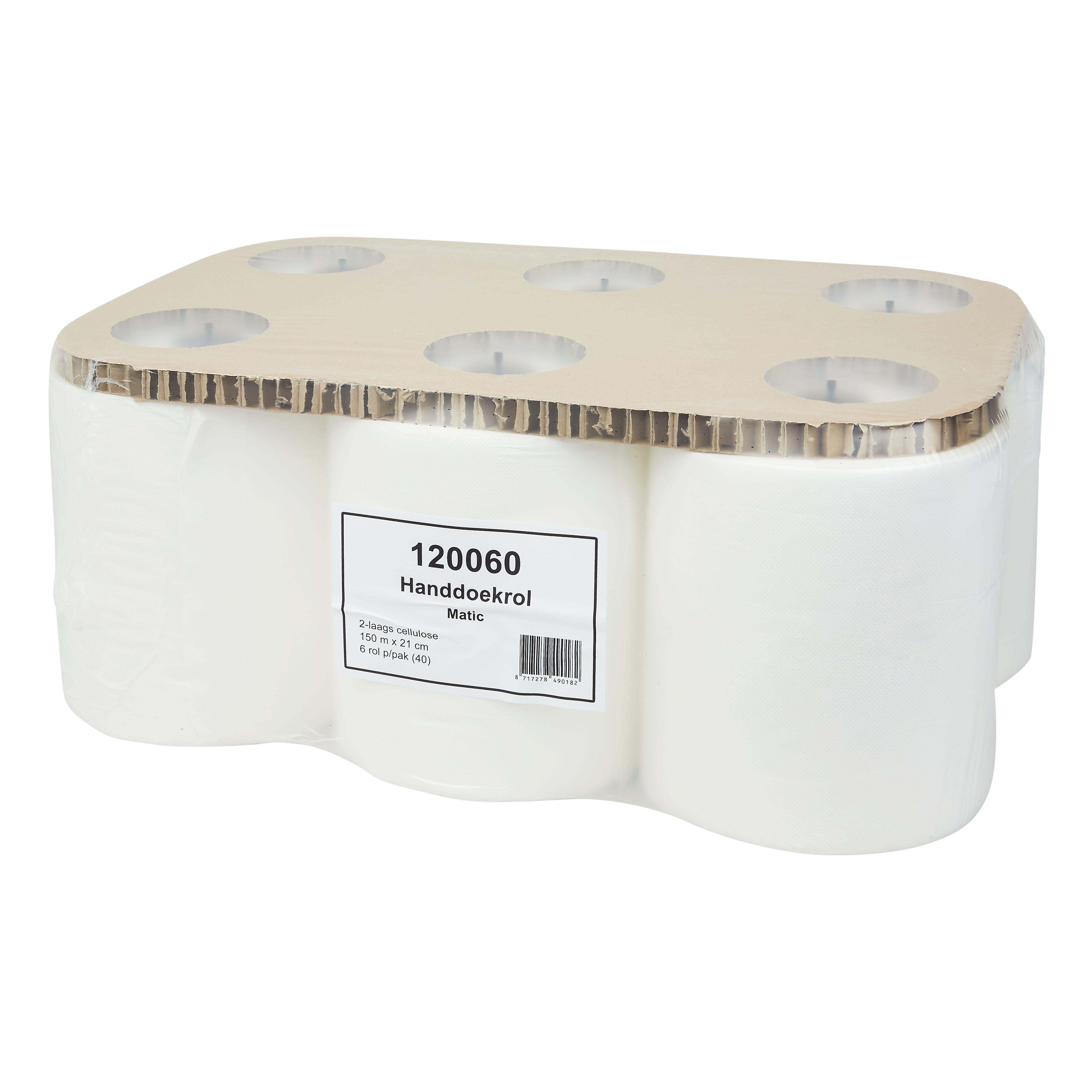 Doseer handdoekrol type Matic is een 2-laags witte handdoekrol van 150 meter. Gemaakt van zacht en absorberend papier voor snelle en hygiënische handdroging. Geschikt voor automatische handdoekroldispensers (Matic systeem).