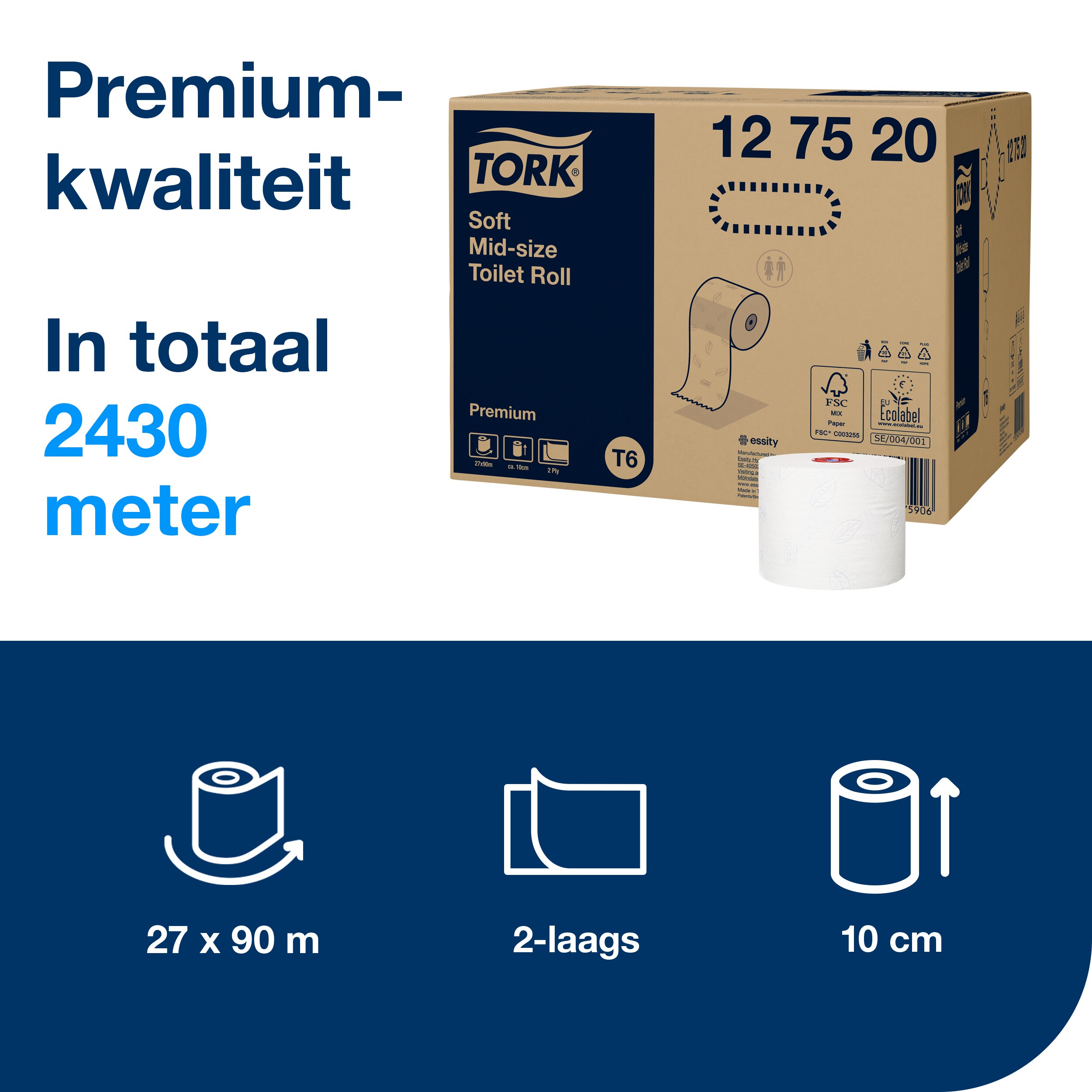 Tork Premium Mid-size toiletpapier 127520 is een zacht en duurzaam 2-laags toiletpapier met hoge capaciteit. Met 90 meter per rol biedt het meer dan drie keer de capaciteit van een standaard toiletrol. Geschikt voor het Tork T6 compact toiletpapiersysteem. Verpakking: 27 rollen.