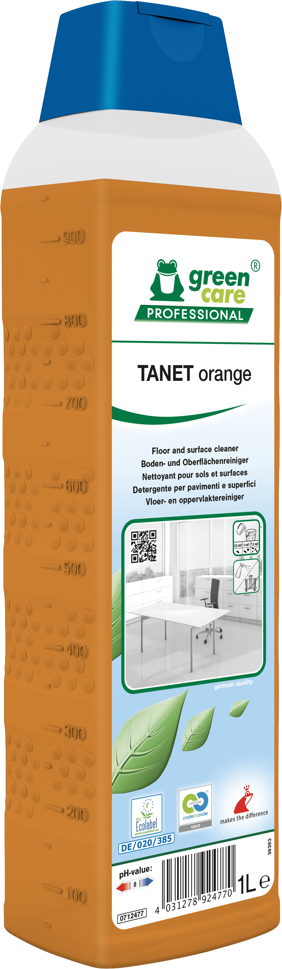 Vloer- en oppervlakkenreiniger, met uitzonderlijke milieu-eigenschappen en een aangename sinaasappelgeur. Uitstekende reinigingsresultaten, zelfs bij lage concentratie. Het product respecteert de biologische cycli en draagt zorg voor de gezondheid en veiligheid van het schoonmaakpersoneel. De plastic fles is gemaakt uit 100% gerecycled plastic afkomstig van selectieve sortering van huishoudelijk afval en is 100% gerecyclebaar - HDPE.