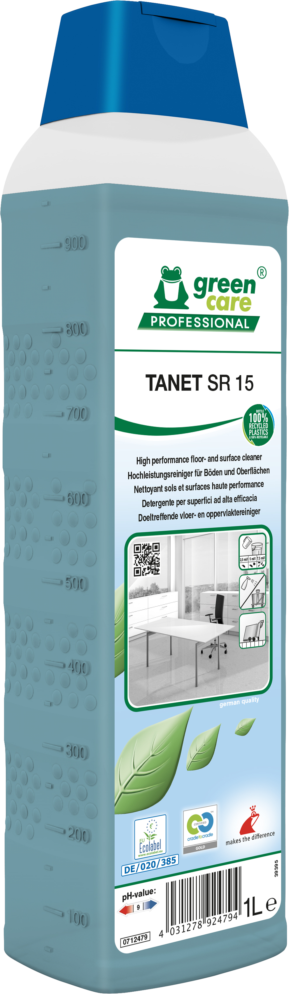 De Green Care Professional TANET SR 15 is een professionele vloer- en oppervlaktereiniger die topprestaties combineert met uitstekende milieueigenschappen. Dankzij het sterke bevochtigingsvermogen verwijdert dit product vuil en vet snel en grondig, zelfs op poreuze vloeren en hydrofobische oppervlakken zoals PUR, zonder strepen achter te laten.