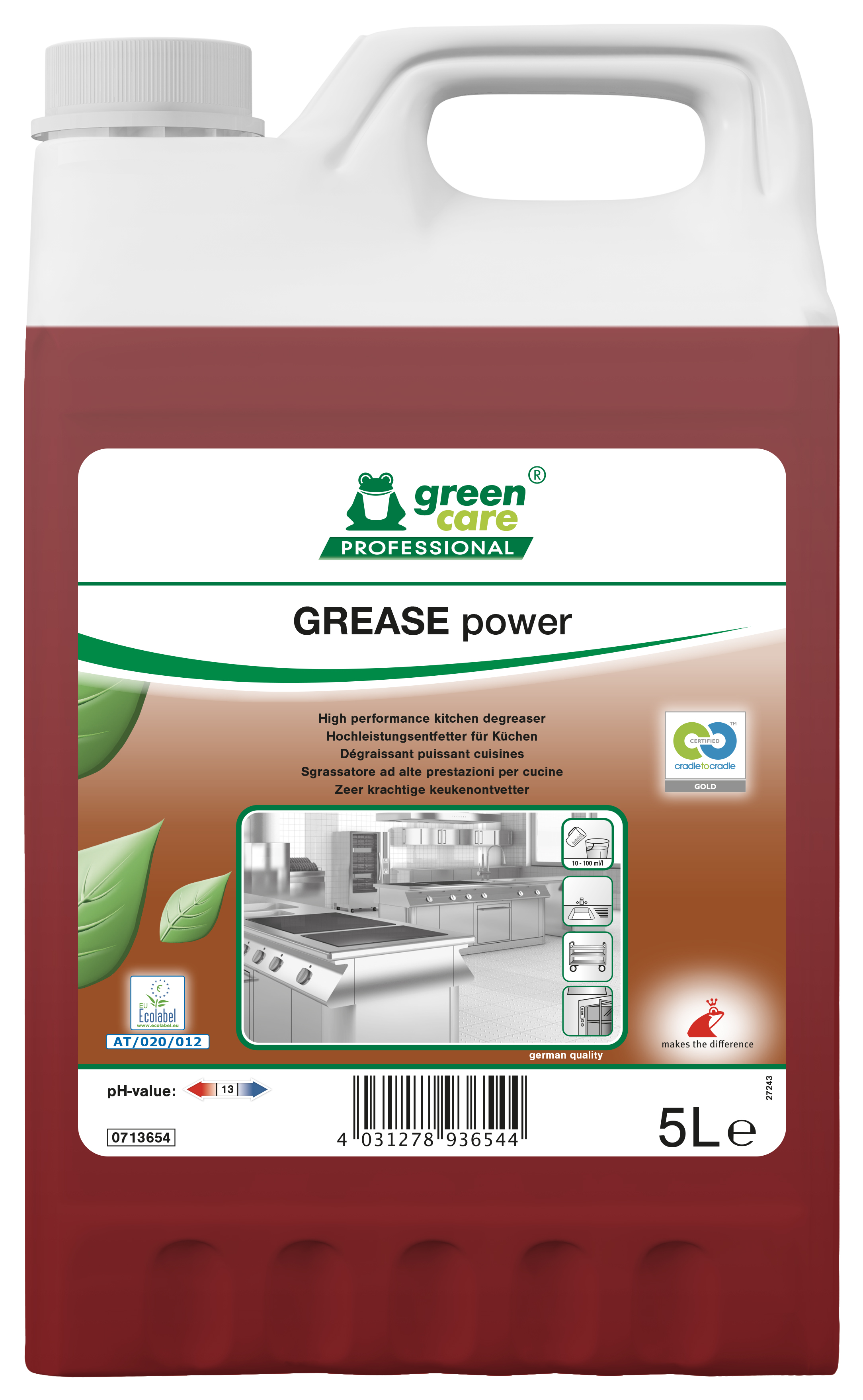 Ecologische krachtige polyvalente reiniger ontvetter, zonder parfum. De schuimspray verwijdert volledig vetstof, gebakken of ingebrand vet. Doeltreffende allesreiniger voor alle vloeren en oppervlakken in keukens: werkbladen, fornuizen, snijgereedschap, dampkappen… Het schuim versterkt de contacttijd en de reiniging. Gebruiksvriendelijk product dat al dan niet verdund gebruikt kan worden via besprenkeling of besproeiing. De can van 5 L kan als navulling voor de schuimspray van 750 ml gebruikt worden maar ook verdund in een emmer, met vochtige mop of microvezeldoek voor de reiniging van vloeren, muren en oppervlakken. Het product respecteert de biologische cycli en draagt zorg voor de gezondheid en veiligheid van het schoonmaakpersoneel.