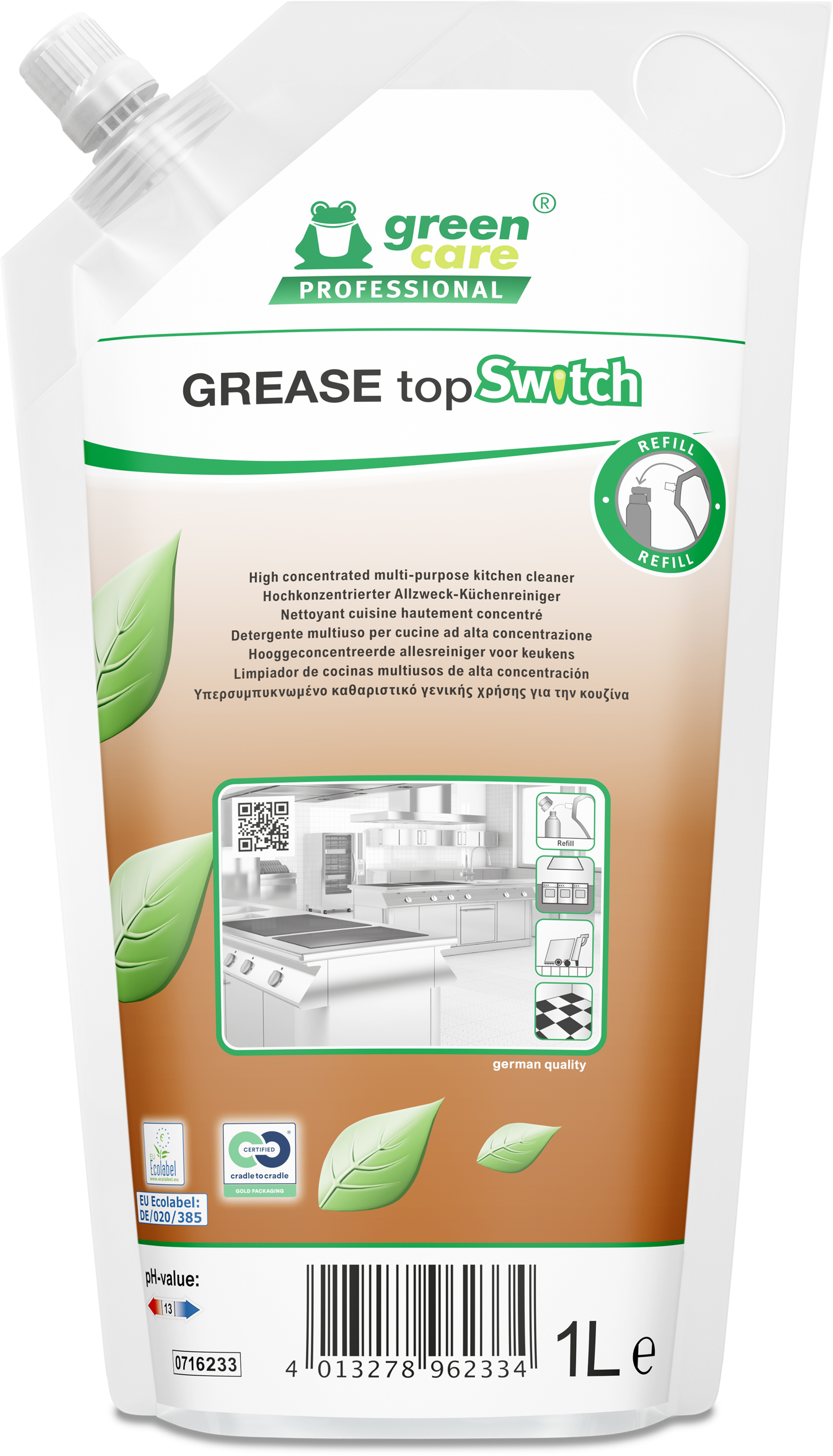 Ecologische ultrageconcentreerde multifunctionele keukenreiniger - ontvetter. GREASE topSwitch kan alle soorten hardnekkig vuil oplossen, is universeel te gebruiken en laat geen resten achter voor uniforme resultaten. De sterk geconcentreerde circulaire formule maakt een kostenefficiënt gebruik mogelijk. GREASE topSwitch kan ook gebruikt worden in sanitaire- en interieurruimtes. Switch navulpouch.