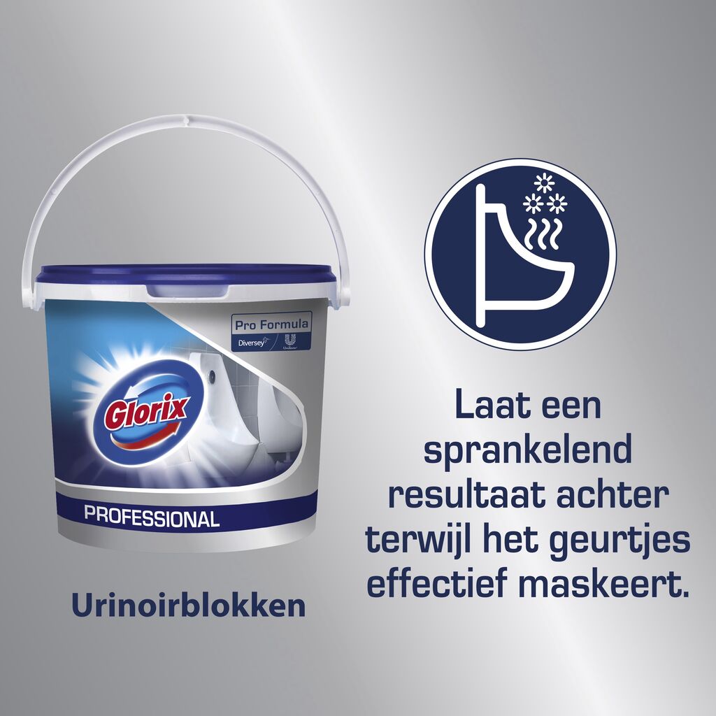 De Glorix Professional urinoirblokken zijn ontwikkeld om sanitaire ruimtes langdurig fris en hygiënisch te houden. De blokken ontgeuren effectief, maskeren urinegeur en helpen de vorming van urine- en kalkaanslag te verminderen.