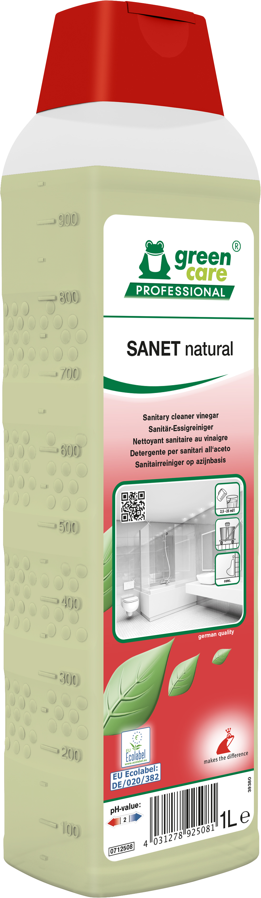Ecologische zure sanitair onderhoudsreiniger op basis van natuurlijk azijnzuur. Geeft reeds bij kleine dosering uitstekende reinigingsprestaties en verwijdert algemene vervuilingen, kalkaanslag en zeepresten. Het product respecteert de biologische cycli en draagt zorg voor de gezondheid en veiligheid van het schoonmaakpersoneel.