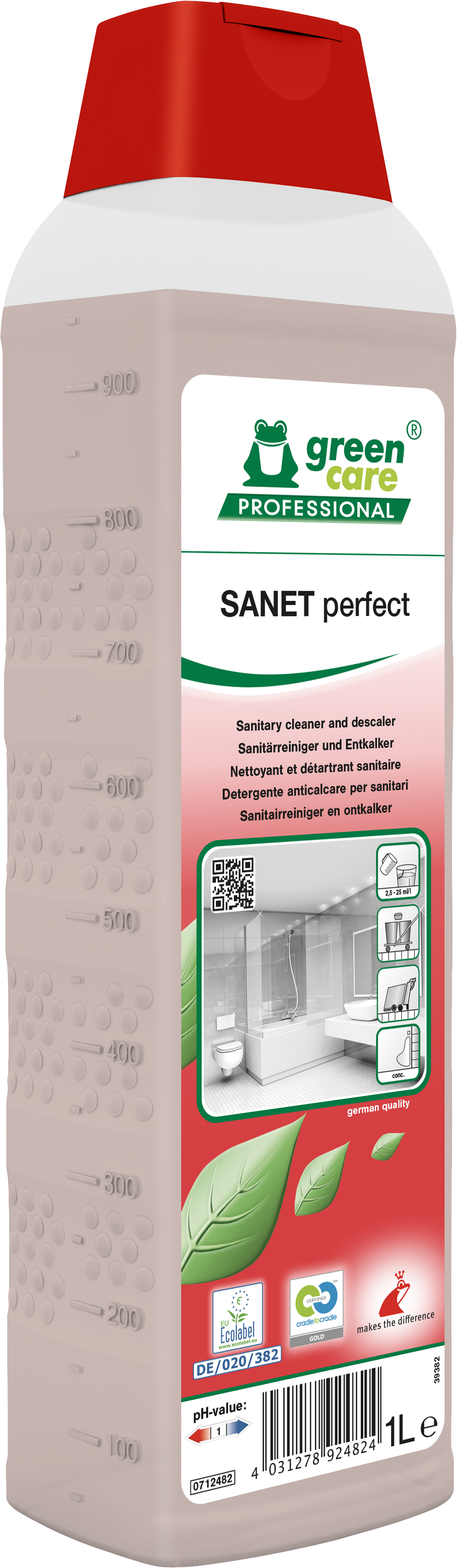 Green Care SANET perfect is een krachtige sanitairreiniger en ontkalker (pH 1) met EU Ecolabel en Cradle to Cradle® certificering. Ontwikkeld voor het effectief verwijderen van kalk, zeepresten en sanitaire vervuiling in professionele sanitaire ruimtes. Verpakking: 10 x 1 liter.