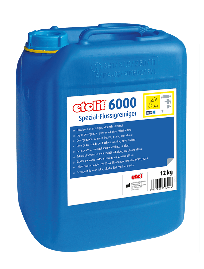 Etolit 6000 is een professioneel vloeibaar vaatwasmiddel voor het reinigen van glaswerk in professionele vaatwasomgevingen. Geschikt voor gebruik bij zacht water en osmosewater. Verpakking: 12 kg can.