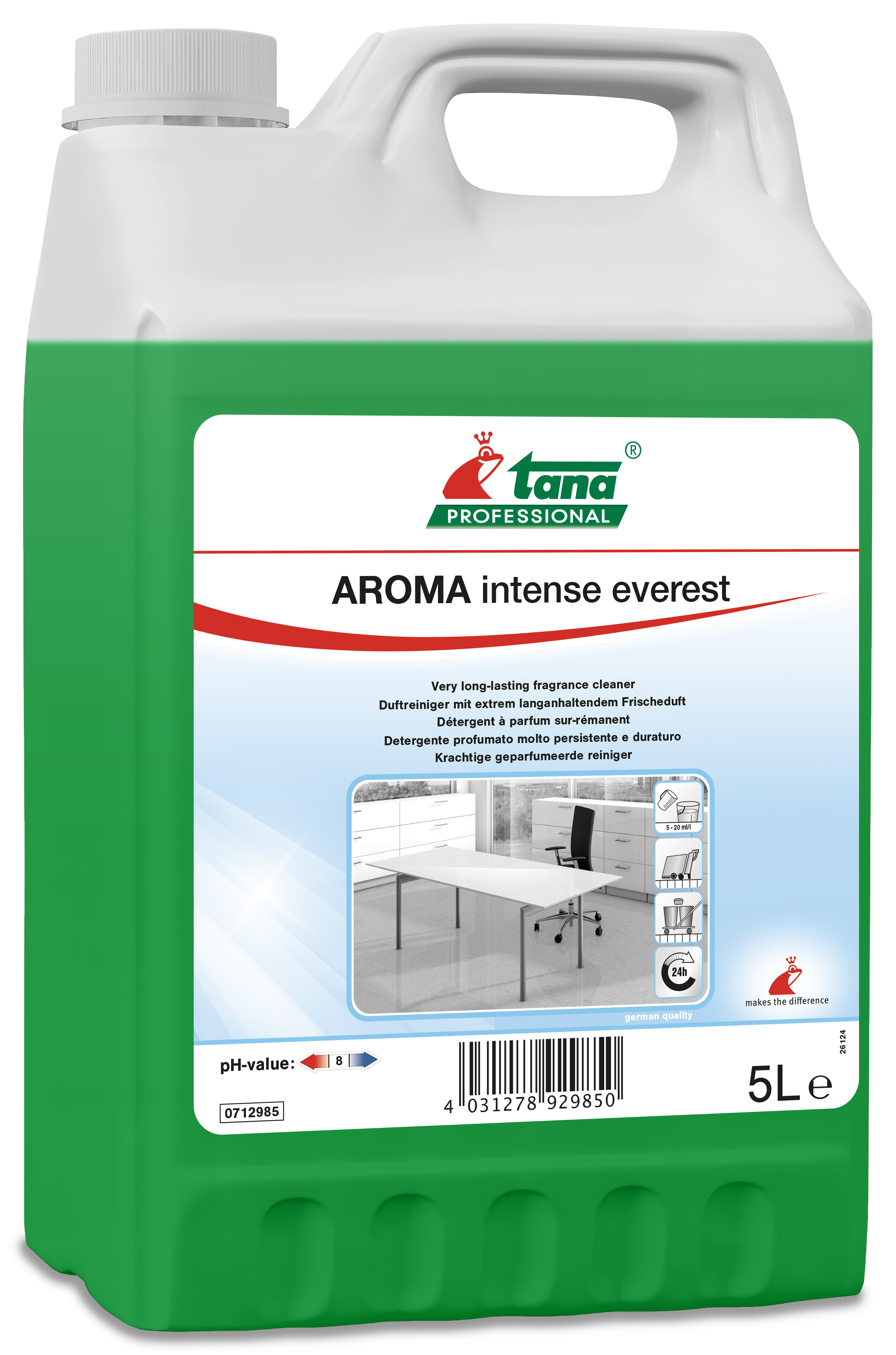 Neutraal reinigingsmiddel, voor vloeren en oppervlakken, met intensief en zeer langdurig parfum (tot 24u, test in "smell chamber"), biedt goede reinigingsprestaties: een explosie van groene geuren met een vleugje citrus, een krachtige houtgeur gecombineerd met de natuurlijke zuivere woudgeur.