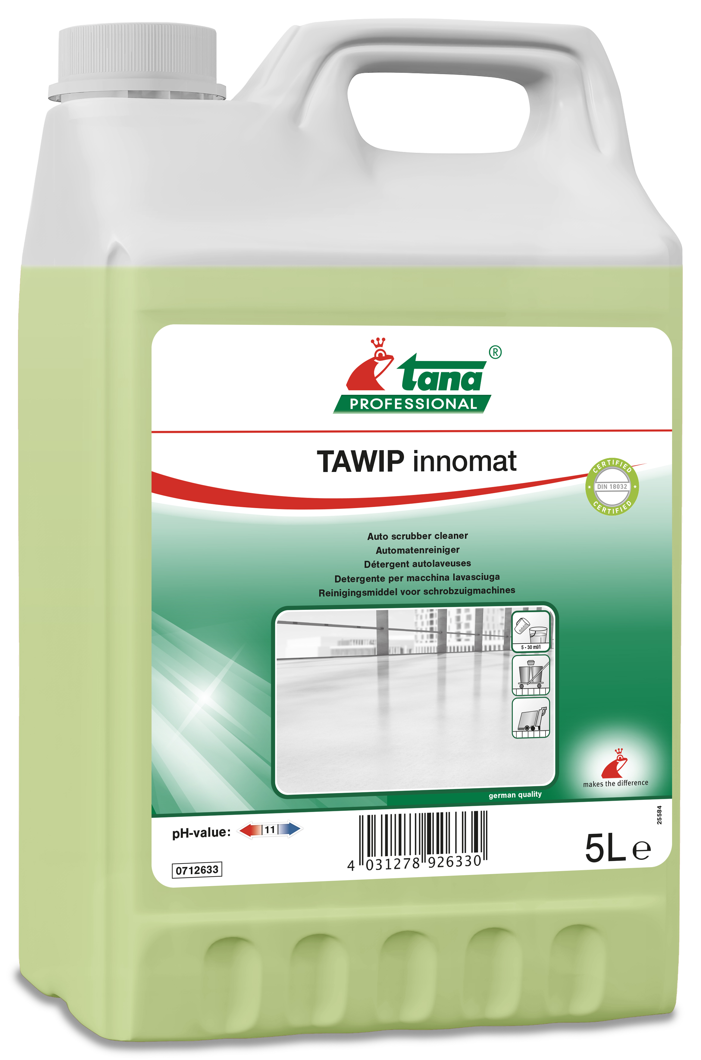 Reinigingsmiddel voor schrobzuigautomaat. Zelfs op hoge werksnelheid wordt hardnekkig vuil probleemloos opgelost. Kan worden toegepast in kostenbesparende concentraties. De voedende bestanddelen beschermen de vloerbekleding, vergemakkelijken het onderhoud en werken antistatisch. Antislip volgens DIN 18032-2.